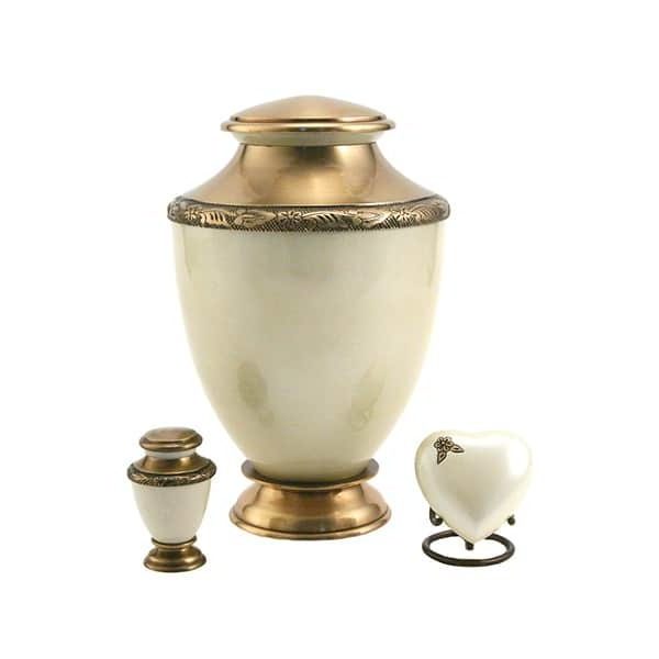 The Eternity Urn Series features a classic urn design with elegant hand-engraved edging and a delicate metallic luster finish. The main portion of the urn is constructed of aluminum and the upper portion, lid and base are made of brass. The Pearl urn is offered in a pearl white finish with brass trim. A matching keepsake urn and heart keepsake are available. Heart stand is available.